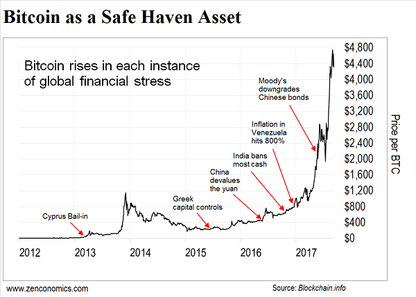 As you can see, money has poured into Bitcoin in each instance of global financial stress. It has quickly become the world’s premier safe haven asset.