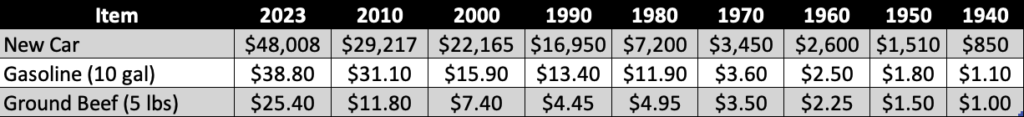 This table tracks the median price of a new car, ten gallons of gas to put in that car, and five pounds of ground beef going back to 1940.