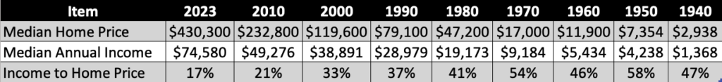 Here we’re tracking the median home price compared to median annual incomes going back to 1940.