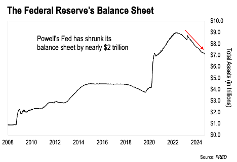 As we can see, Powell has allowed nearly $2 trillion worth of Treasury bonds to mature without buying more. This effectively drains liquidity from the financial system. That, in turn, puts upward pressure on interest rates.