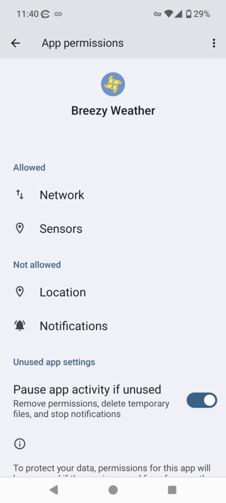 Breezy Weather asks for access to my phone’s network, sensors, location, and notifications function. And I’m allowing it to access the network and sensors. That’s it.