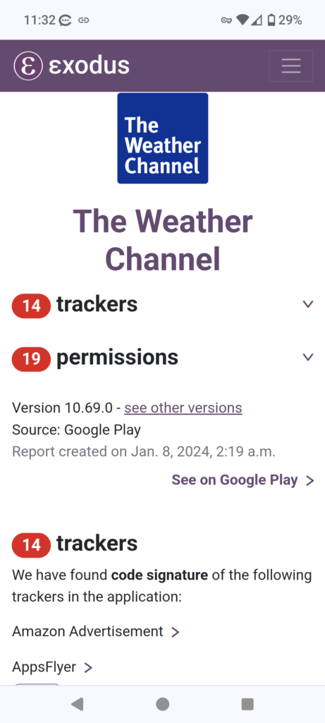 Some apps only had one or two trackers attached to them. Others were even more egregious. For example, the Weather Channel app came packaged with 14 different trackers. Have a look: