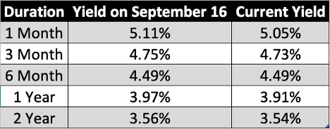 This shows us that the Fed’s rate cut was already priced into the market. Short term Treasury rates have not fallen much since the big announcement.
