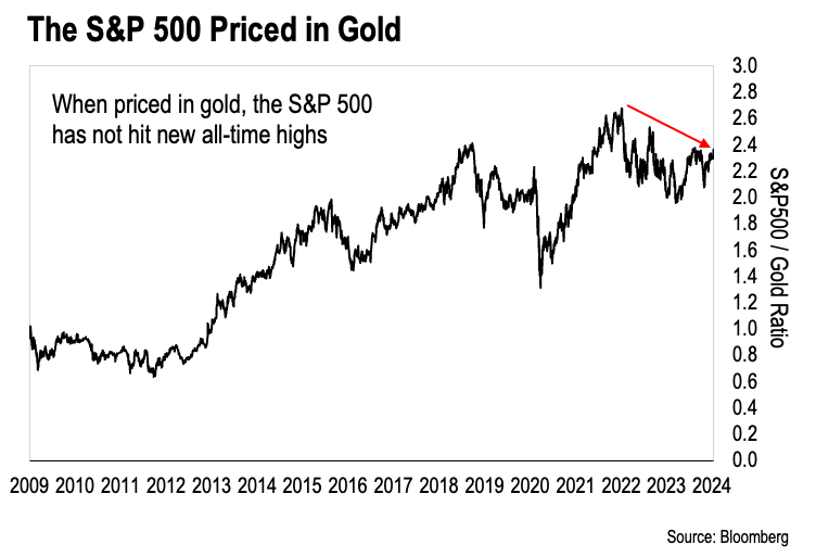 As we can see, the S&P 500 did not make new all-time highs last month when we price the index in terms of gold. Instead, pricing the S&P 500 in gold reveals a declining trend in the stock market.