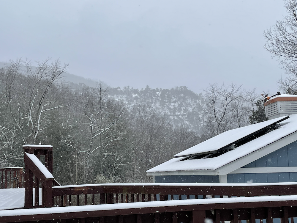 I snapped this one from behind my home office this morning. I never tire of seeing the majestic barefaced cliffs in the background covered in snow.