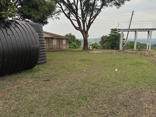 The black items to the left are the water tanks before they were installed on top of the platform. And the building we see in the background is one of the blocks of the Primary School at Mwera.