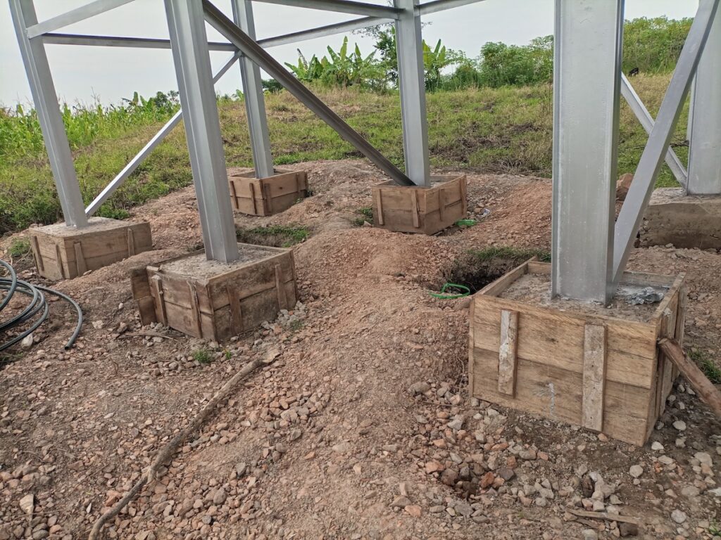 This is the water tank’s support structure. It features concrete footings at the base molded in wooden forms. They are what provide a stable base for the steel framework rising above.