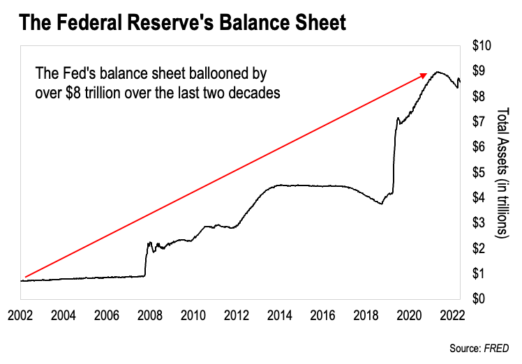 As we can see, the Fed owned less than $1 trillion worth of assets in 2002. But over the next 20 years it bought over $8 trillion worth of bonds.