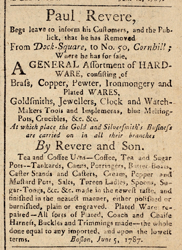 Here’s an advertisement Paul put out on behalf of Revere and Son in 1787: