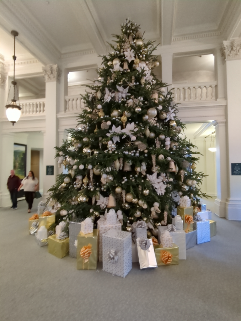 When they made it back to the Homestead, several other members of the Grounds team were ready for them. Together, they unhooked the tree, hoisted it up, and marched it right through the front doors of the resort. I’m sure that was a sight to see.